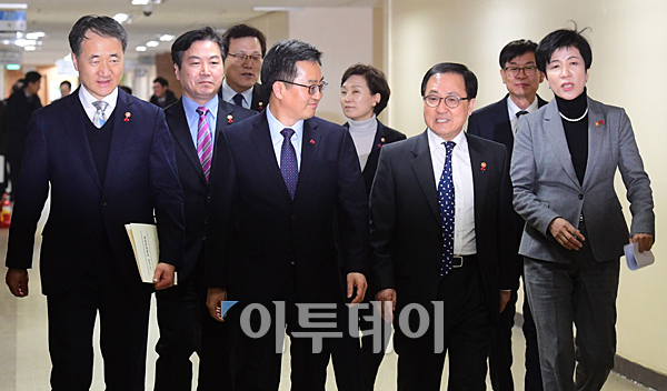 김동연(왼쪽에서 네번째) 경제부총리 겸 기획재정부 장관이 27일 서울 종로구 정부서울청사에서 열린 2018년 경제정책방향 관계부처 합동브리핑에 각 부처 장관들과 함께 참석하고 있다. 고이란 기자 photoeran@