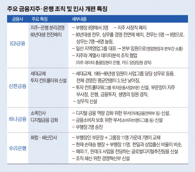 주요 금융지주사와 은행의 연말 조직개편과 인사가 모두 마무리됐다. 50대 젊은 임원들이 경영 전면에 배치됐고 4차산업 혁명 변화에 대응하기 위해 디지털금융 전담 조직이 신설됐다. 계파 갈등으로 은행장 교체라는 초유의 사태를 겪어야 했던 우리은행은 계파 안배를 통해 화합형 인사를 단행했다.