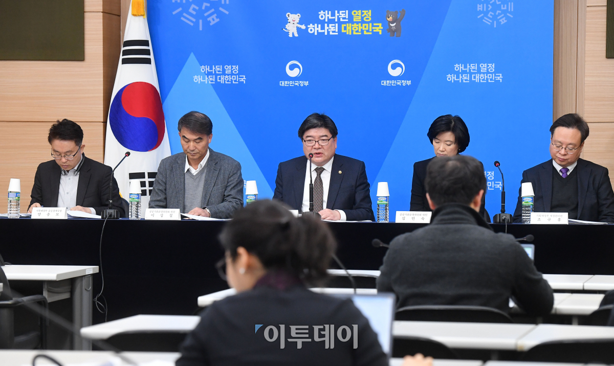 김용진(가운데) 기획재정부 제2차관이 28일 서울 종로구 정부서울청사 별관 브리핑룸에서 공공기관 경영평가제도 개편 방안을 발표하고 있다. 정부는 이날 제15차 공공기관운영위원회를 열어 공공기관의 사회적 가치 평가 배점을 높이고, 시민·사회단체의 참여 확대 등을 골자로 하는 '공공기관 경영평가제도 개편방안'을 확정했다. 이동근 기자 foto@