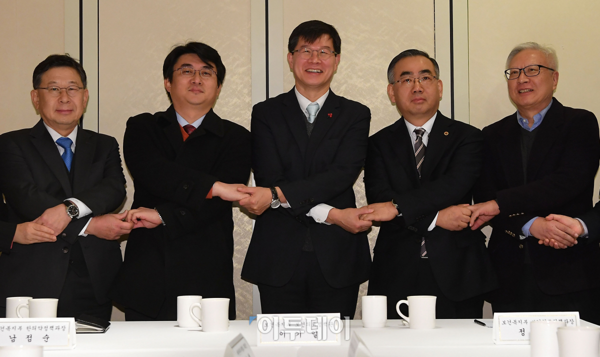 이기일 보건복지부 보건의료정책관이 29일 오전 서울 중구 달개비에서 열린 의료계-한의계-정부 의료현안협의체 1차회의에서 참석자들과 기념촬영을 하고 있다. 왼쪽부터 남점순 복지부 한의약정책과장, 최도영 대한한의학회장, 이승혁 대한한의사협회 부회장, 이 정책관, 김록권 대한의사협회 부회장, 이윤성 대한의학회장, 정윤순 복지부 보건의료정책과장. 이동근 기자 foto@
