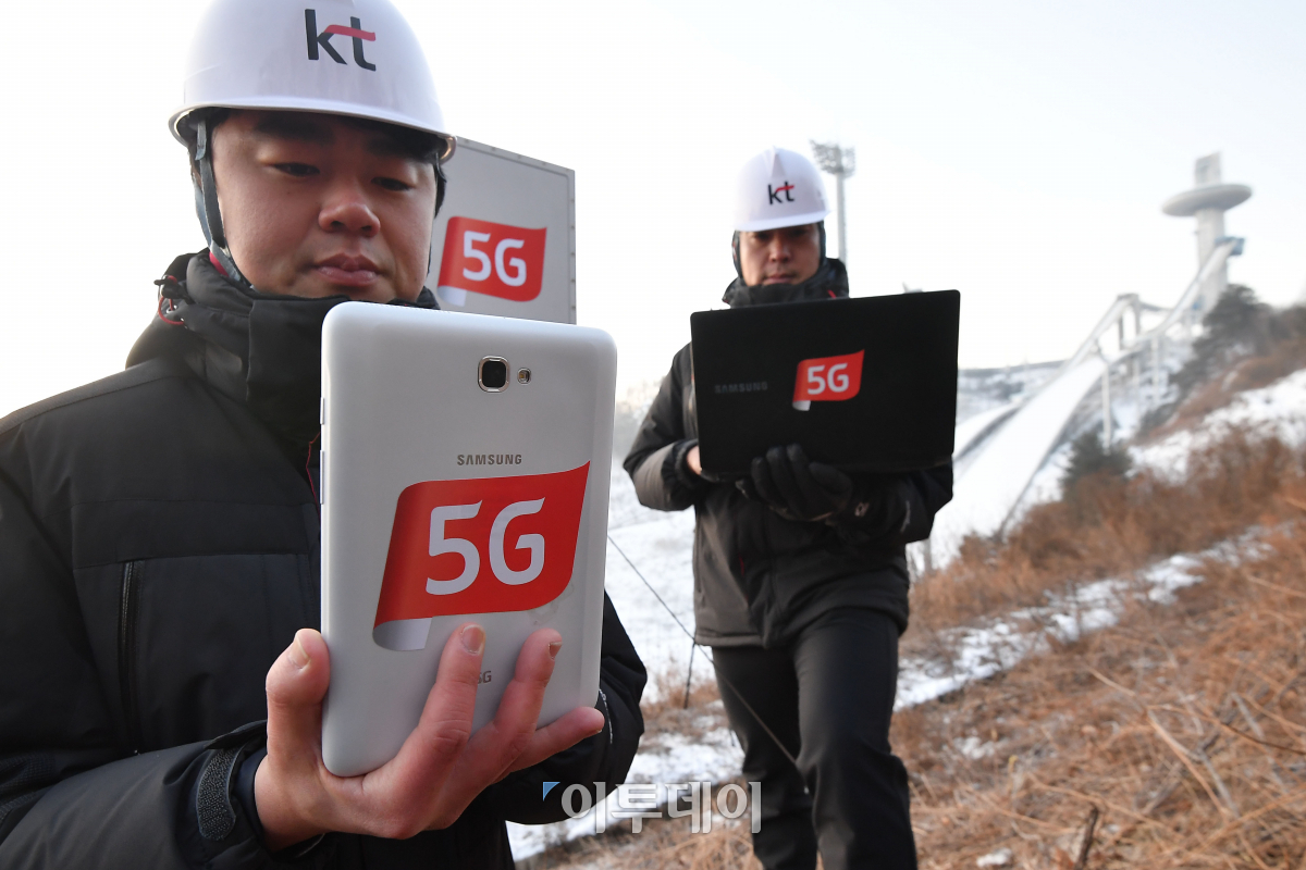 2018 평창동계올림픽의 해가 밝았다. KT는 세계 최초로 이번 대회에서 4세대 이동통신 LTE보다 100배 빠른 5G 시범 서비스를 선보인다. 대회를 50일 앞둔 지난 21일 강원 평창군 알펜시아 올림픽파크 내 스키점프대 인근에서 KT직원들이 5G 이동식 기지국 점검을 하고 있다. 이동근 기자 foto@