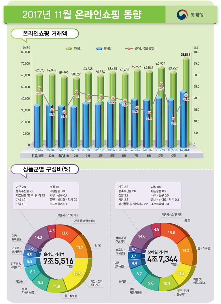 통계청이 2일 발간한 온라인쇼핑 동향에 따르면 지난해 11월 온라인쇼핑 거래액은 7조5516억 원으로 전년 동월대비 21.7% 증가했다. 2001년 관련통계를 시작한 이래 첫 7조 원 돌파다.