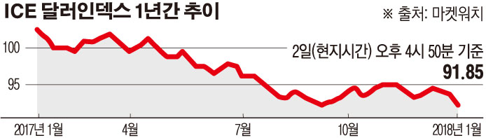 달러화 가치는 미국 세제 개혁과 금리 인상, 경제 지표 호조에도 불구하고 하락세를 면치 못했다. CNN머니에 따르면 작년 한 해 동안 ICE 달러인덱스는 약 10% 가까이 떨어졌다. 지난달 15일 이후에만 약 2%가 빠졌다.