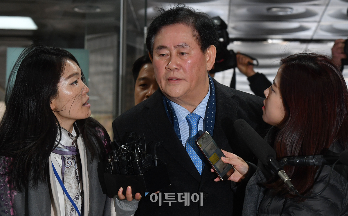 박근혜 정부 시절 국정원으로 부터 특수활동비 1억원을 받은 혐의로 구속영장이 청구된 최경환 자유한국당 의원이 3일 영장실질심사를 받기 위해 서울중앙지법에 출석하며 취재진의 질문을 받고 있다. 이동근 기자 foto@
