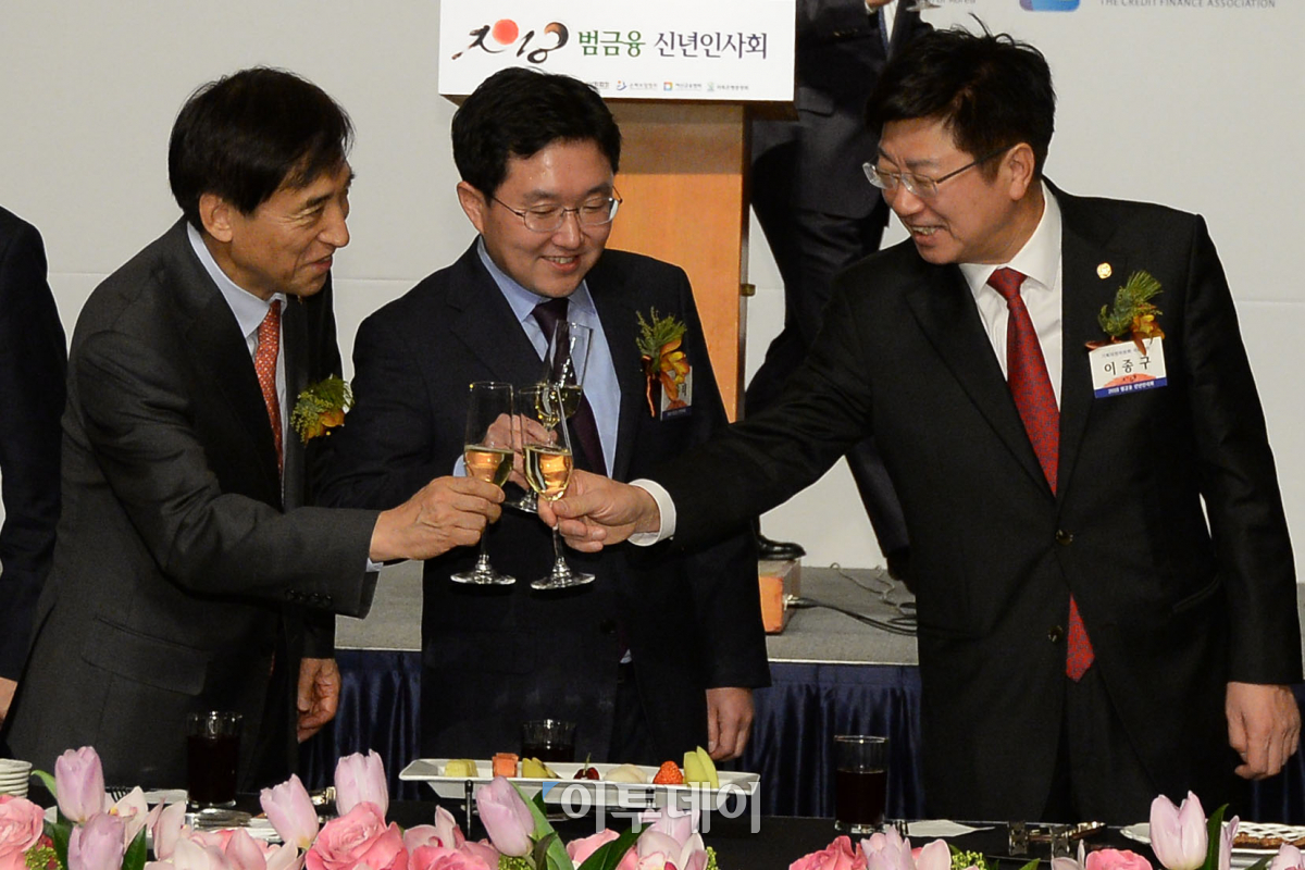 이주열 한국은행 총재, 김용태 국회 정무위원장, 이종구 자유한국당 의원(왼쪽부터)이 3일 서울 소공동 롯데호텔에서 열린 2018년 범금융 신년인사회에서 건배를 하고 있다. 이동근 기자 foto@