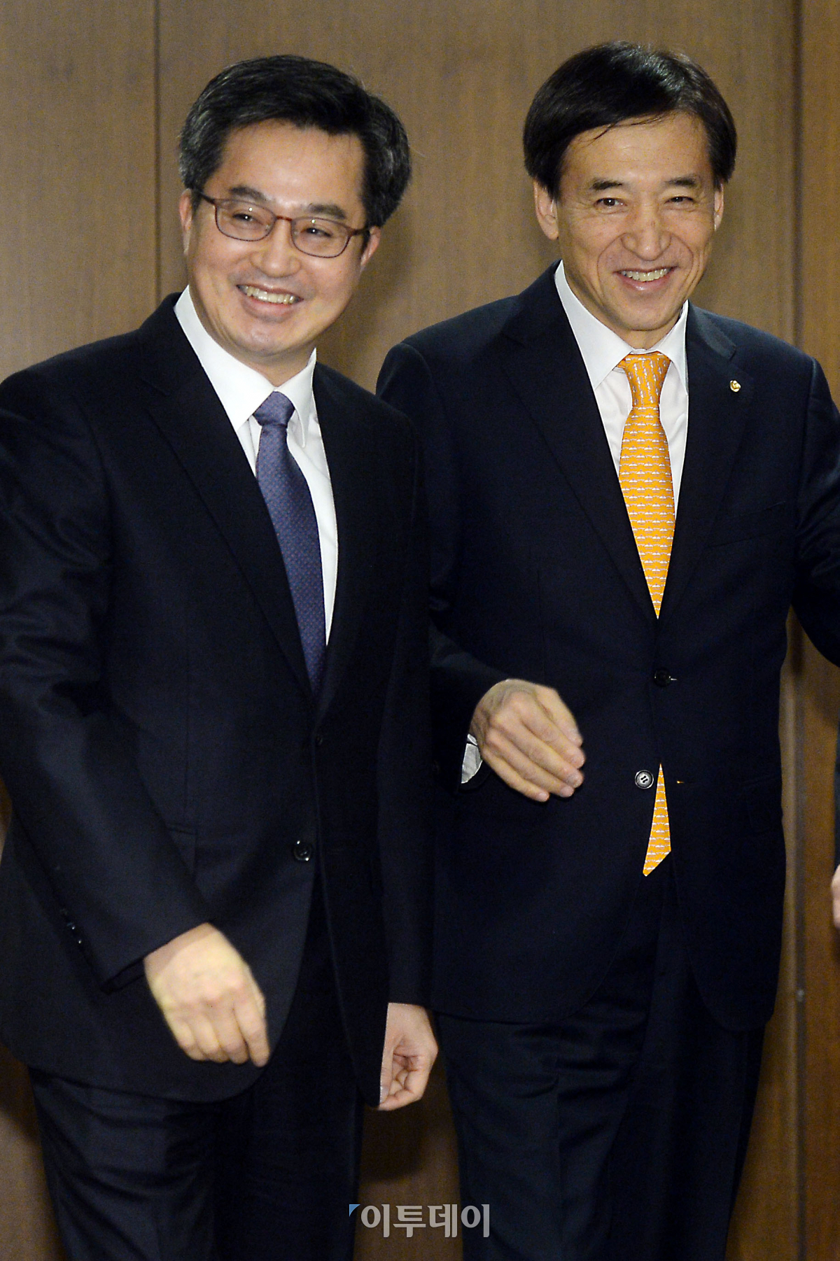 김동연(왼쪽) 경제부총리 겸 기획재정부 장관과 이주열 한국은행 총재가 4일 오전 서울 중구 은행회관에서 열린 조찬회동에 나란히 참석하고 있다. 이동근 기자 foto@