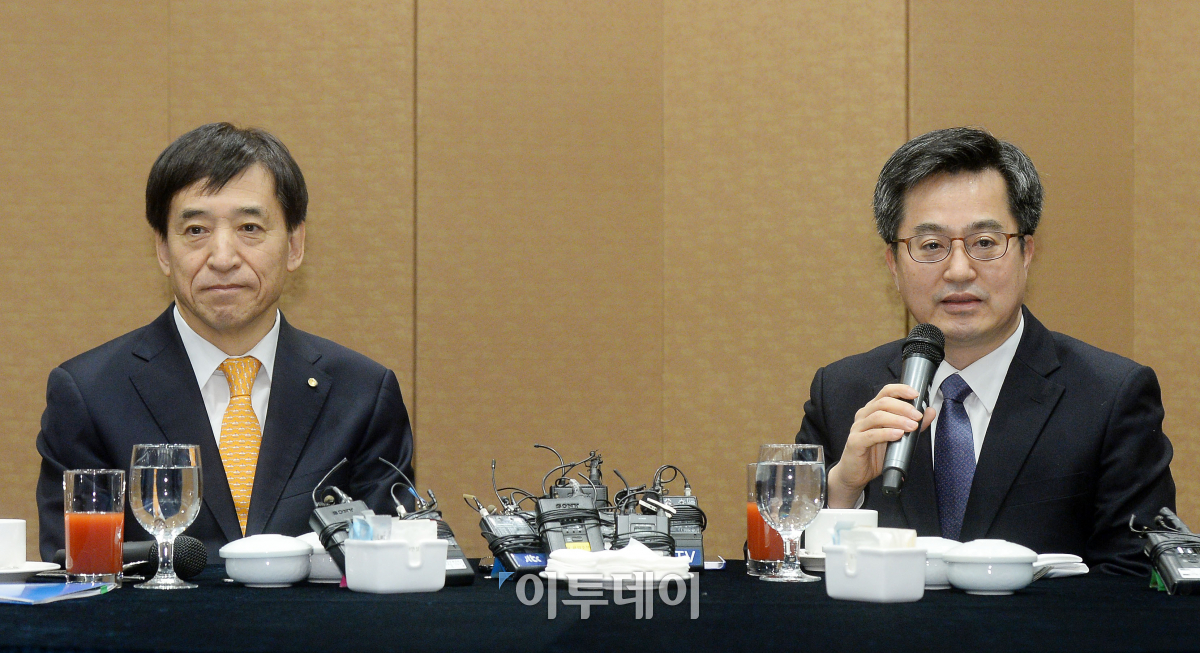 김동연(오른쪽) 경제부총리 겸 기획재정부 장관이 4일 오전 서울 중구 은행회관에서 열린 이주열 한국은행 총재와의 조찬회동에 앞서 모두발언을 하고 있다. 이동근 기자 foto@