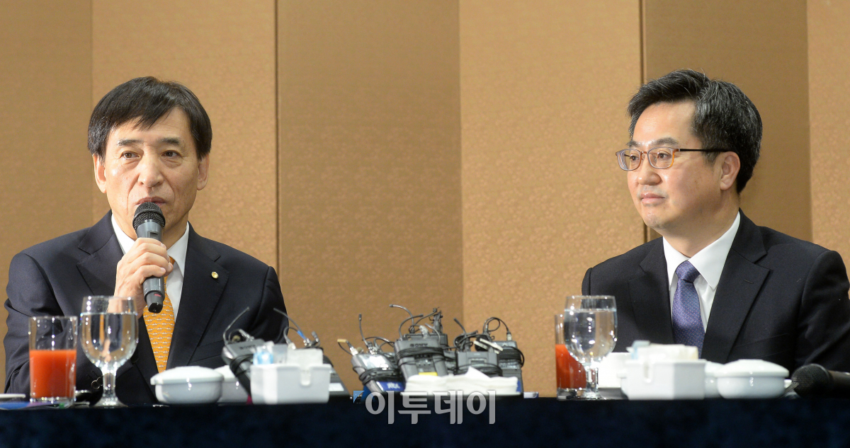 이주열(왼쪽) 한국은행 총재가 4일 오전 서울 중구 은행회관에서 열린 김동연 경제부총리 겸 기획재정부 장관과의 조찬회동에 앞서 모두발언을 하고 있다. 이동근 기자 foto@