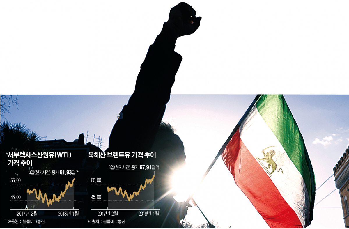 시장에서는 지난달 28일 촉발된 이란의 반정부 시위가 확산하면서 국제 원유 시장에 공급 차질을 빚을 것이라는 관측이 고조되고 있다. 석유수출국기구(OPEC) 내 3위 산유국인 이란의 원유 생산에 차질이 생기면 글로벌 공급 과잉이 해소될 것이라는 관측이 배경에 있다.
