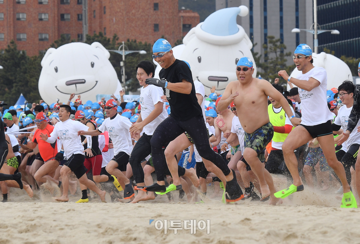 7일 부산 해운대구 해운대해수욕장에서 열린 제31회 북극곰수영축제에서 참가자들이 겨울바다를 향해 뛰어들고 있다. 이동근 기자 foto@