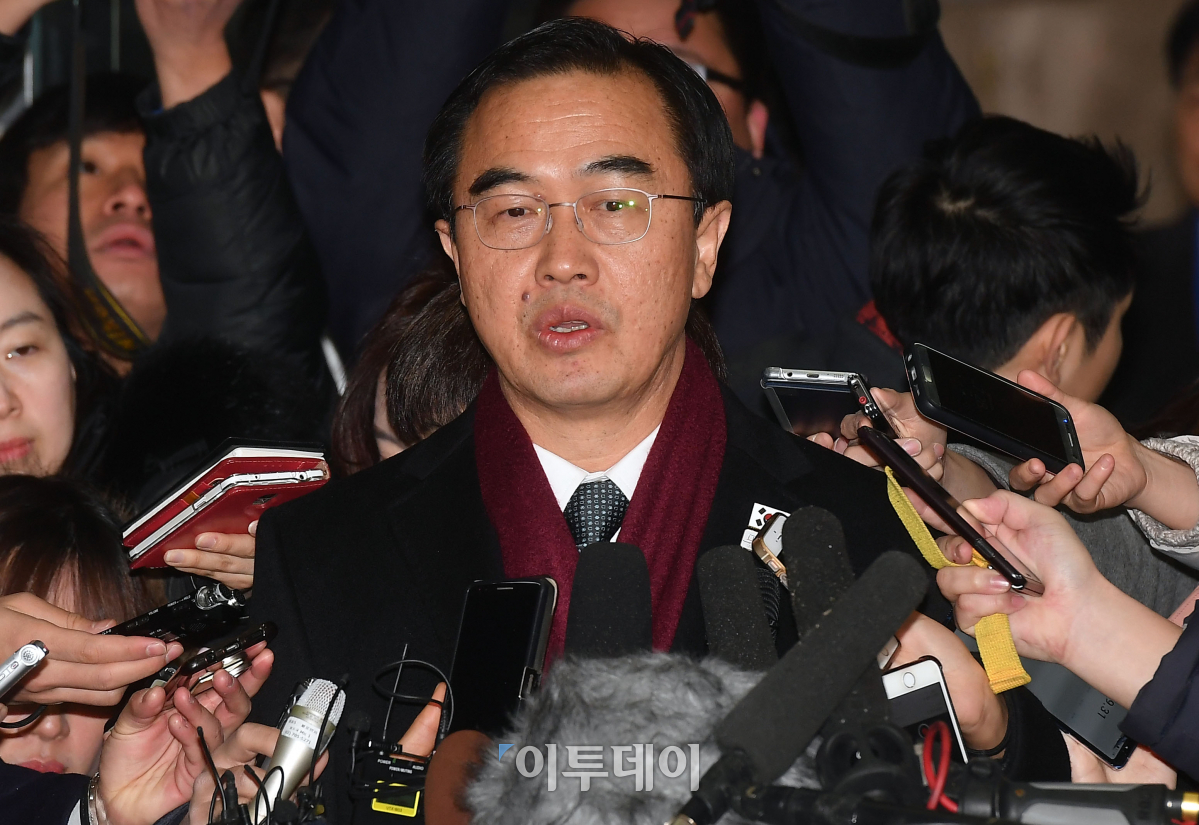조명균 통일부장관이 9일 오전 서울 종로구 남북회담본부에서 남북 고위급 회담을 위해 판문점으로 출발하기 앞서 취재진의 질문에 답하고 있다. 이동근 기자 foto@