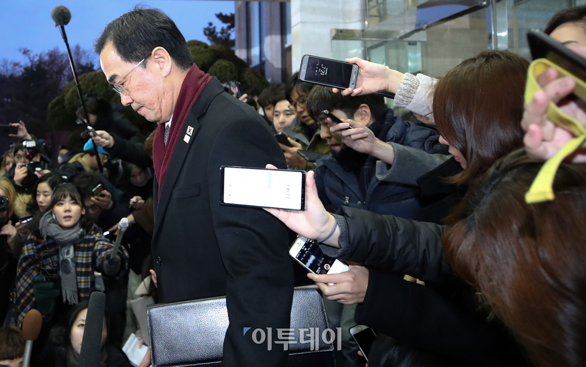 조명균 통일부장관이 9일 오전 판문점 평화의 집에서 열리는 남북 고위급 회담을 위해 서울 종로구 남북회담본부를 나서고 있다. 이동근 기자 foto@
