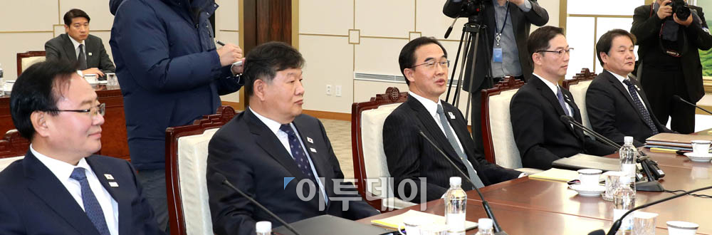 9일 남북 고위급회담이 판문점 남측 평화의 집에서 열렸다. 조명균 통일부 장관을 비롯한 남측 대표단이 평화의 집에서 리선권 조국평화통일위원회 위원장을 비롯한 북측 대표단과 전체회의 시작에 앞서 환담하고 있다. 사진공동취재단