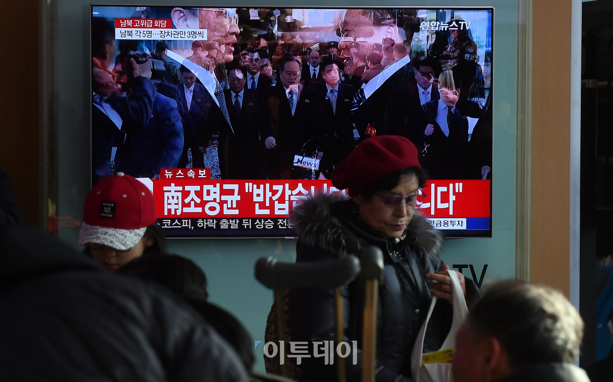 남북 고위급 회담이 열리는 9일 오전 서울역 대합실에서 시민들이 관련 뉴스 속보를 시청하고 있다 이동근 기자 foto@