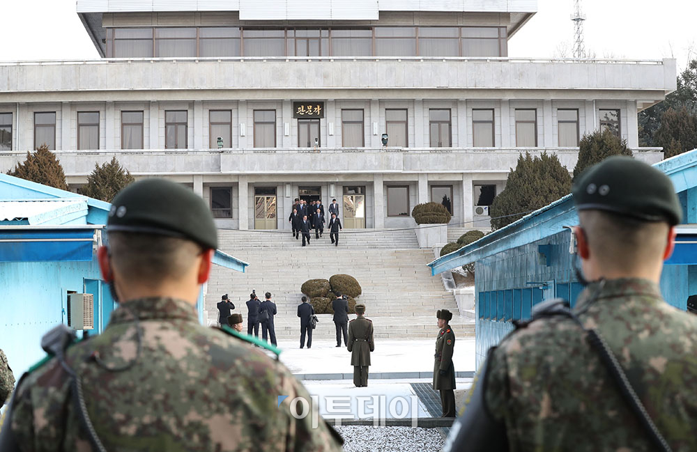 9일 남북 고위급회담이 판문점 남측 평화의 집에서 열렸다. 리선권 조국평화통일위원회 위원장을 비롯한 북측 대표단이 판문각을 나와 남측으로 이동하고 있다. 사진공동취재단
