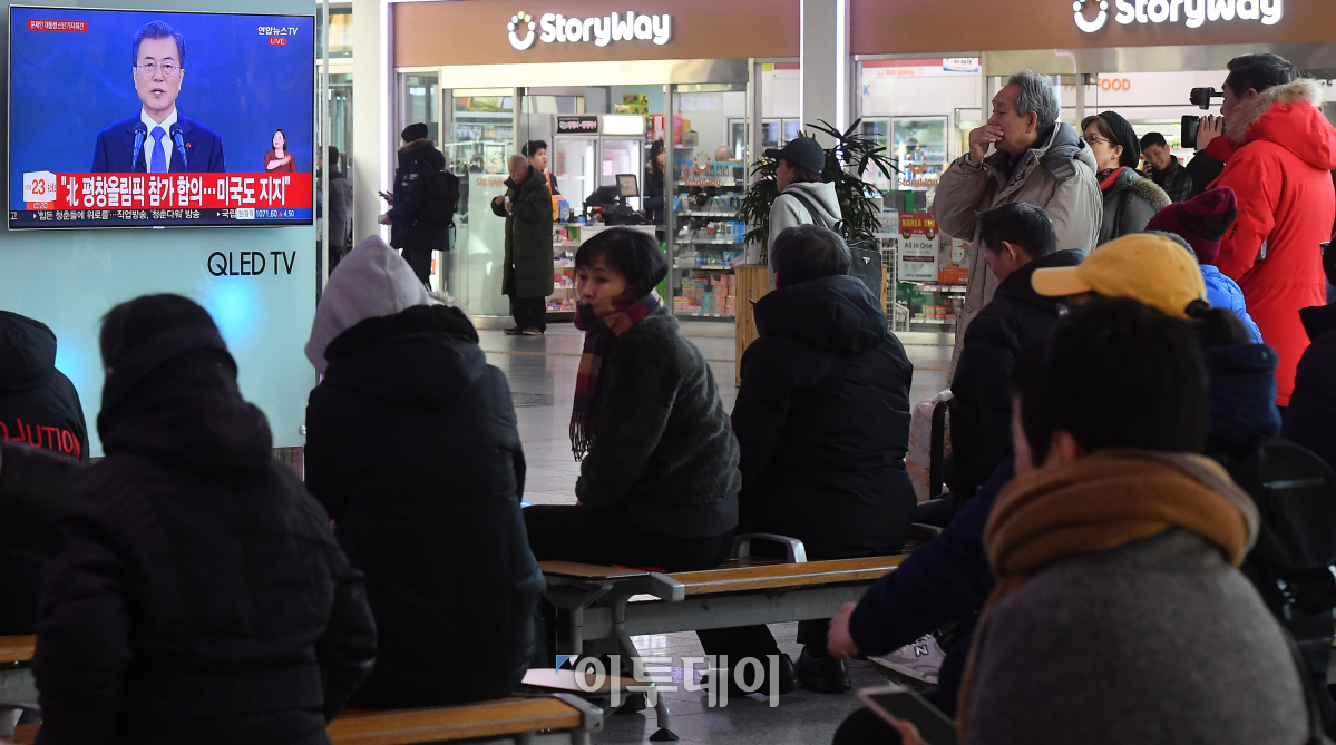 문재인 대통령이 10일 오전 취임 후 첫 신년기자회견을 연 가운데 서울역 대합실에서 시민들이 문 대통령의 첫 신년사를 청취하고 있다. 이동근 기자 foto@