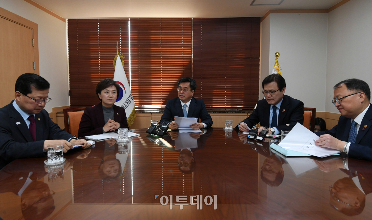 김동연 경제부총리 겸 기획재정부 장관(가운데)이 11일 서울 세종로 정부서울청사에서 경제현안간담회를 열고 관계부처 장·차관들과 최근 주택시장 동향 및 대응방향에 대한 논의를 하고 있다. 왼쪽부터 심보균 행정안전부 차관, 김현미 국토교통부 장관, 김 부총리, 최종구 금융위원장, 한승희 국세청장. 이동근 기자 foto@