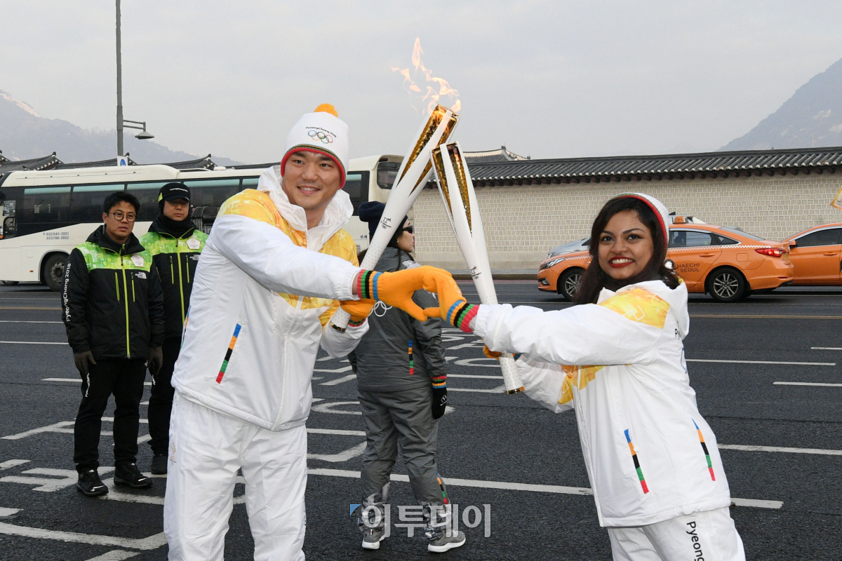 2018 평창동계올림픽 성화 서울 봉송 둘째날인 14일 서울 광화문 인근에서 주자로 나선 최낙현(왼쪽)씨와 모니샤 씨가 토치키스를 하며 손으로 하트를 그리고 있다. 이동근 기자 foto@