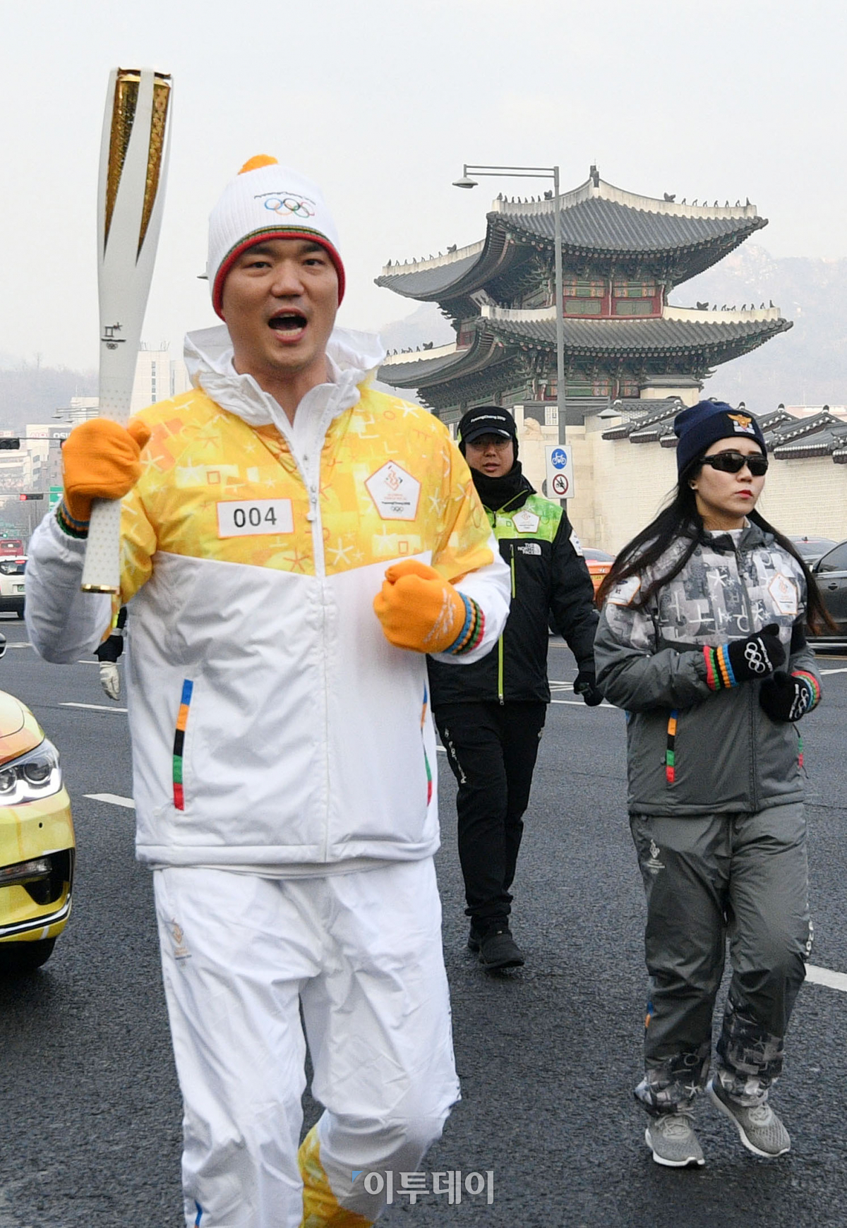2018 평창동계올림픽 성화 서울 봉송 둘째날인 14일 서울 광화문 인근에서 주자로 나선 최낙현씨가 성화봉송을 하고 있다. 이동근 기자 foto@