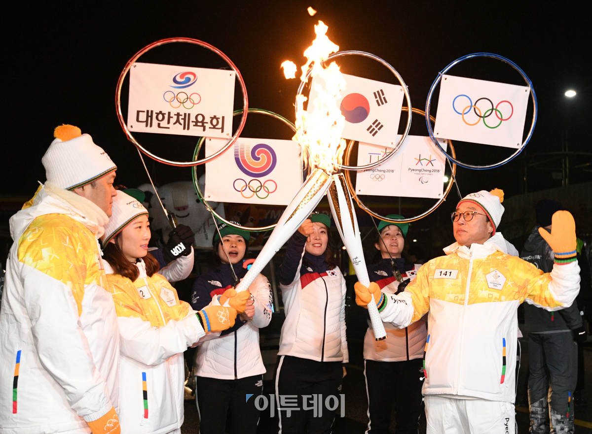2018 평창동계올림픽 성화 서울 봉송 둘째날인 14일 서울 송파구 잠실종합운동장에서 주자로 나선 전충렬(오른쪽) 대한체육회 사무총장과 여자아이스하키 국가대표 박종아 선수가 토치키스를 하고 있다. 이동근 기자 foto@