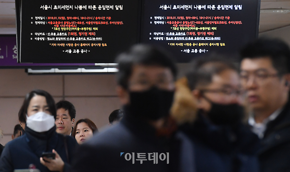 미세먼지 비상저감조치가 시행된 15일 오전 서울 여의도역 전광판에 대중교통 무료 운행 안내문이 표시돼 있다. 이날 출근 시간 첫차부터 9시까지, 퇴근시간인 오후 6시부터 9시까지 서울 시내버스와 마을버스, 지하철 1~9호선, 우이신설선 요금이 면제된다. 이동근 기자 foto@