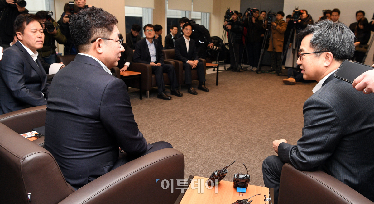 김동연(오른쪽) 경제부총리 겸 기획재정부 장관이 15일 오전 서울 중구 대한상의에서 열린 혁신성장 옴부즈만 출범식에서 인사말을 하고 있다. 이동근 기자 foto@