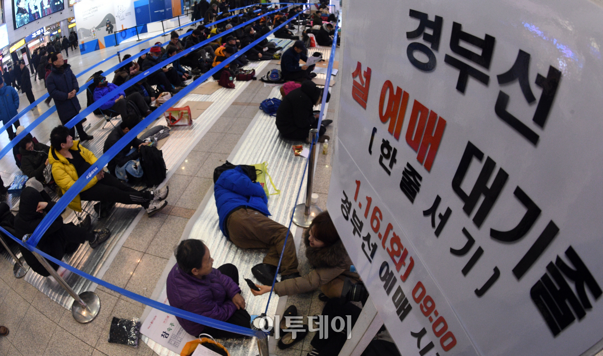 설 열차승차권 예매일인 16일 오전 서울역 매표소 앞에 표를 구매하려는 시민들이 이른 아침부터 줄지어 기다리고 있다. 올해 설 열차승차권은 17일까지 레츠코레일 홈페이지와 지정된 역 창구, 승차권 판매대리점에서 예매할 수 있다. 16일은 경부·경전·충북·동해선, 17일에는 호남·전라·장항·중앙선 등의 승차권을 판매한다. SRT는 23일과 24일 예매할 수 있다. 이동근 기자 foto@