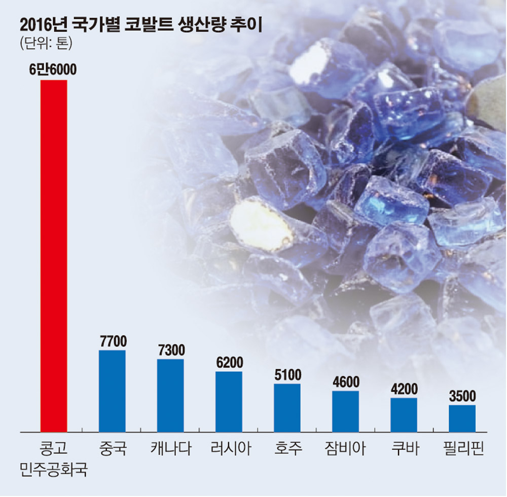 16일 세금인상을 발표한 콩고민주공화국(DRC)은 전 세계에서 가장 많은 양의 코발트를 생산한다. 2016년 기준 DRC의 코발트 생산량은 6만6000톤으로 압도적 1위다. DRC의 뒤를 이어 중국, 캐나다, 러시아 등이 코발트를 생산하고 있지만 2위인 중국은 7700톤, 캐나다는 7300톤, 러시아는 6200톤으로 DRC에 절반도 되지 않는다.