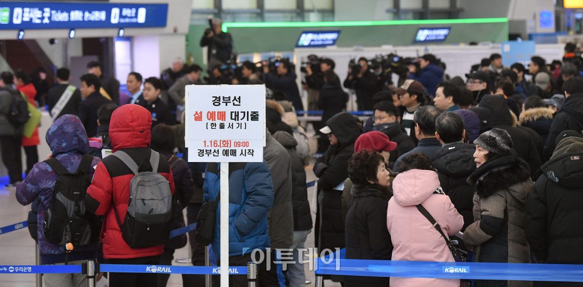 설 열차승차권 예매일인 16일 오전 서울역 매표소 앞에 표를 구매하려는 시민들이 줄지어 서있다. 올해 설 열차승차권은 17일까지 레츠코레일 홈페이지와 지정된 역 창구, 승차권 판매대리점에서 예매할 수 있다. 16일은 경부·경전·충북·동해선, 17일에는 호남·전라·장항·중앙선 등의 승차권을 판매한다. SRT는 23일과 24일 예매할 수 있다. 이동근 기자 foto@