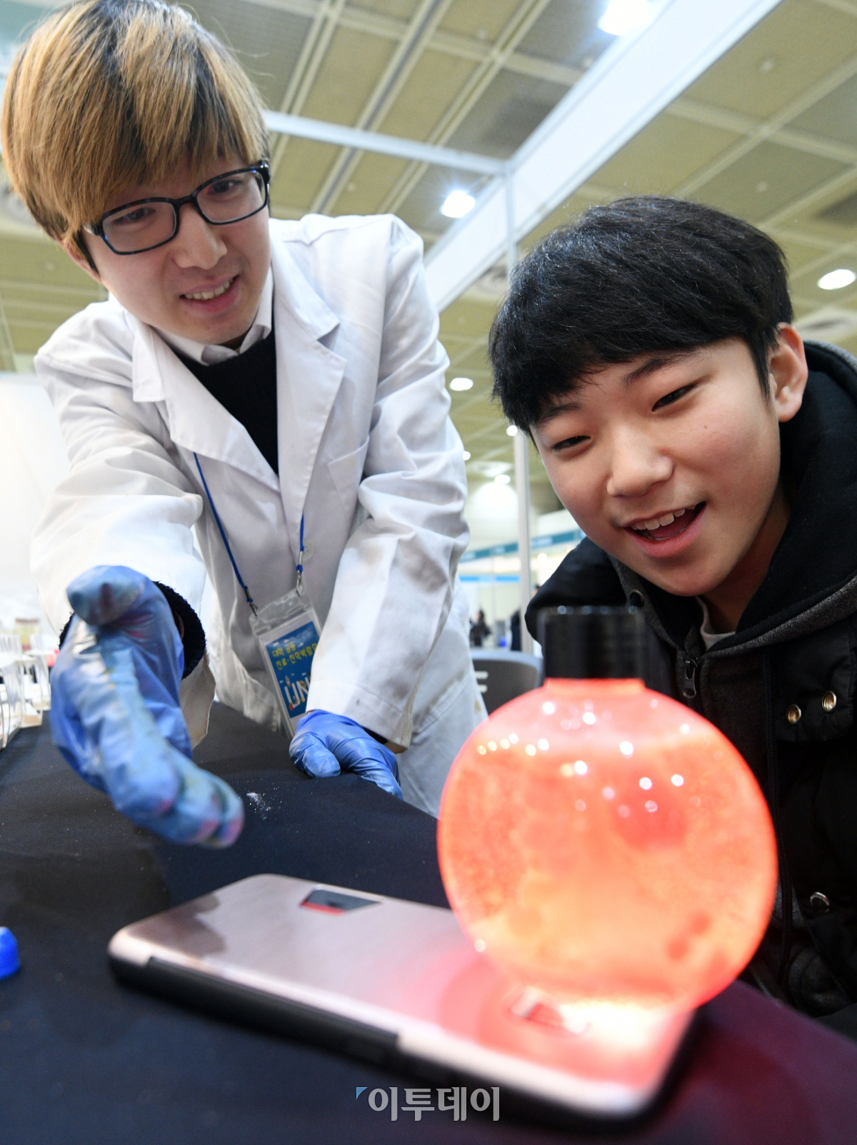 대학 공동 진로·진학 박람회가 16일 서울 강남구 코엑스에서 열린 가운데 인천대 화학과 부스를 찾은 학생이 화학실습 체험을 하고 있다. 숭실대, 인천대, 인하대, 국립한경대가 공동주최하는 이번 박람회는 전공체험관, 진학상담관 등을 통해 학생들이 본인에게 맞는 학과가 무엇인지 직접 체험할 수 있는 기회를 제공한다. 이동근 기자 foto@