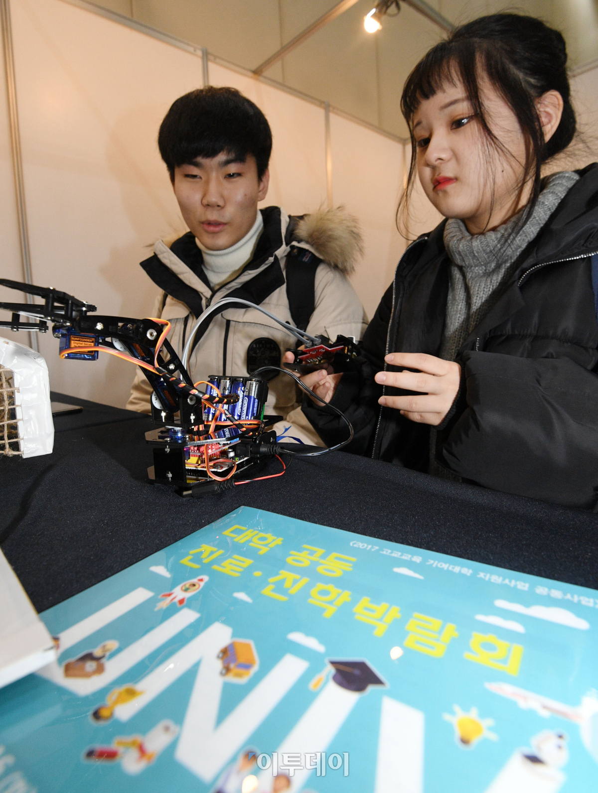 대학 공동 진로·진학 박람회가 16일 서울 강남구 코엑스에서 열린 가운데 학생들이 로봇 작동 체험을 하고 있다. 숭실대, 인천대, 인하대, 국립한경대가 공동주최하는 이번 박람회는 전공체험관, 진학상담관 등을 통해 학생들이 본인에게 맞는 학과가 무엇인지 직접 체험할 수 있는 기회를 제공한다. 이동근 기자 foto@