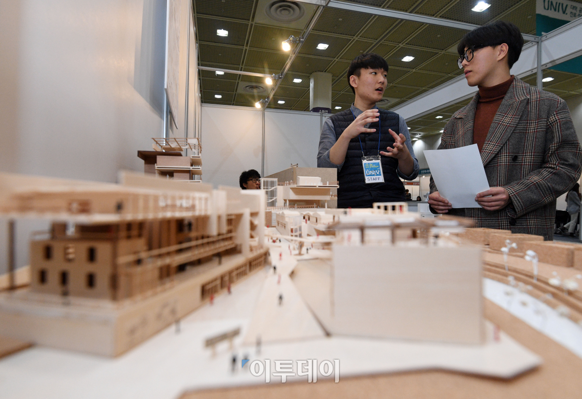 대학 공동 진로·진학 박람회가 16일 서울 강남구 코엑스에서 열린 가운데 인하대 건축학과 부스를 찾은 한 학생이 진학상담을 받고 있다. 숭실대, 인천대, 인하대, 국립한경대가 공동주최하는 이번 박람회는 전공체험관, 진학상담관 등을 통해 학생들이 본인에게 맞는 학과가 무엇인지 직접 체험할 수 있는 기회를 제공한다. 이동근 기자 foto@