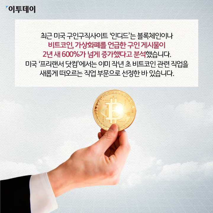 미국 ‘프리랜서 닷컴’에서는 이미 작년 초 비트코인 관련 직업을 새롭게 떠오르는 직업 부문으로 선정한 바 있습니다.