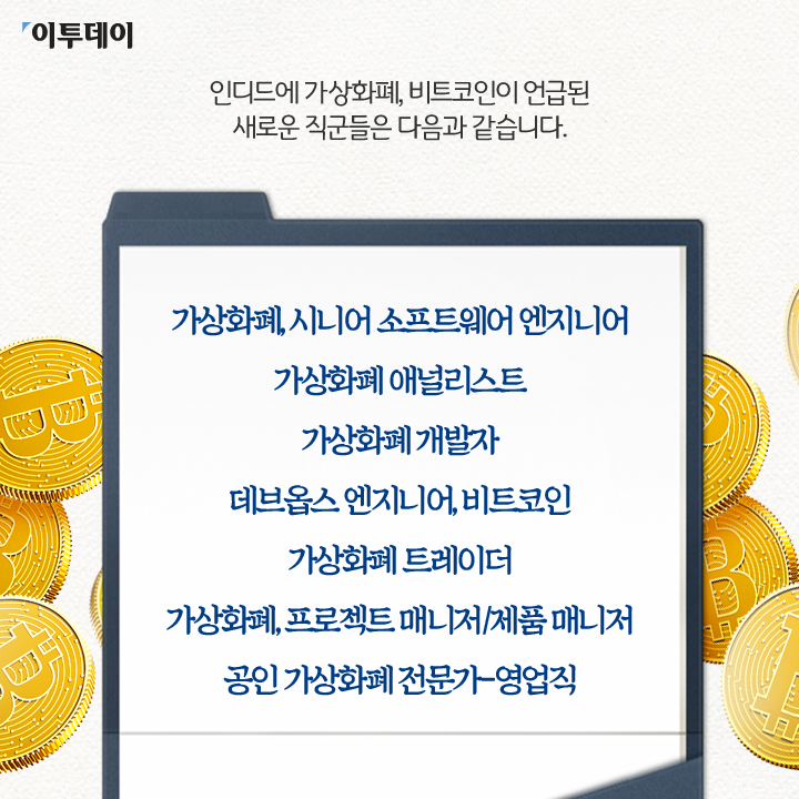 인디드에 가상화폐, 비트코인이 언급된 새로운 직군들은 다음과 같습니다.