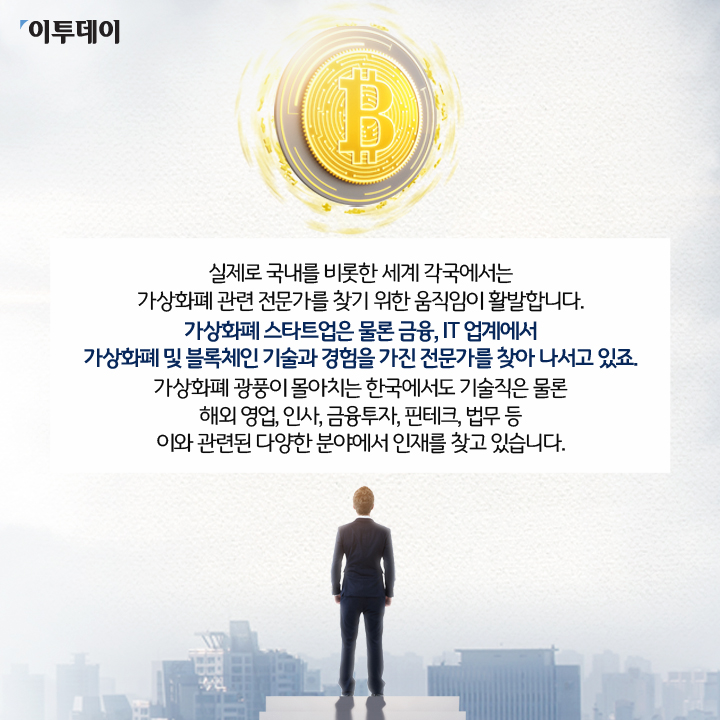 가상화폐 스타트업은 물론 금융, IT 업계에서 가상화폐 및 블록체인 기술과 경험을 가진 전문가를 찾아 나서고 있죠.
