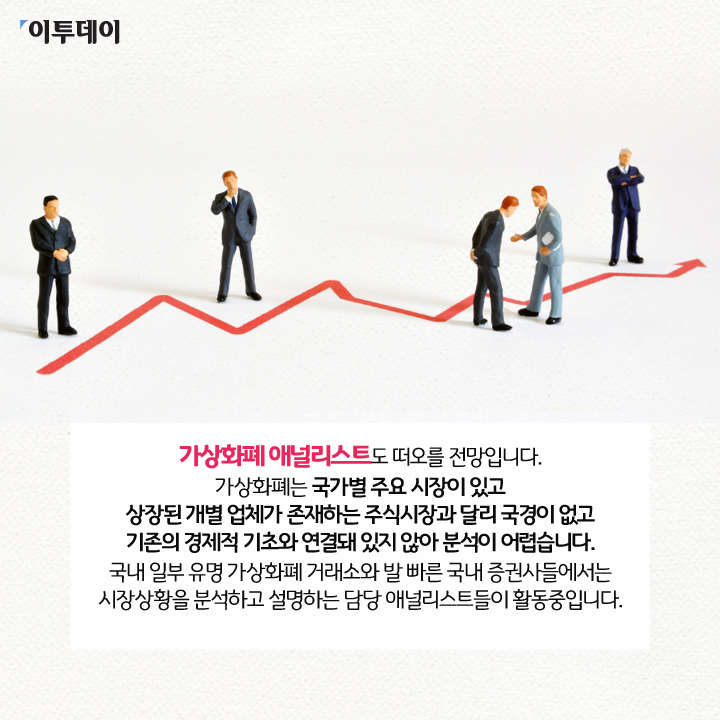 가상화폐 애널리스트도 떠오를 전망입니다. 가상화폐는 국가별 주요 시장이 있고 상장된 개별 업체가 존재하는 주식시장과 달리 국경이 없고 기존의 경제적 기초와 연결돼 있지 않아 분석이 어렵습니다.