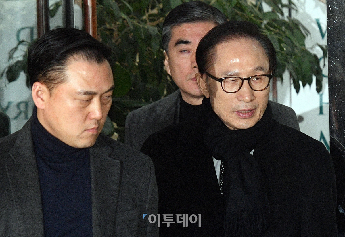이명박 전 대통령이 17일 검찰의 특수활동비 수사 관련 입장을 밝힌 후 서울 강남구 삼성동 사무실을 나서고 있다. 이동근 기자 foto@