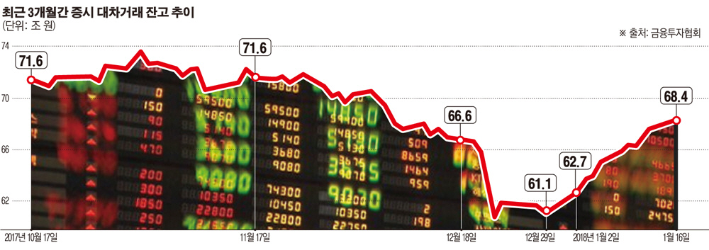 1년 전만 해도 50조 원 안팎에 머물던 증시 대차거래 잔고는 지난해 국내 코스피지수의 사상최고가 경신 행진 속에 사상 처음으로 70조 원대를 넘겼다. 이후 증시가 조정을 겪었던 연말에는 이 수치가 60조 원대 초반까지 줄었다. 하지만 연초 코스피지수가 2500선을 되찾고 코스닥지수도 16년 만에 900선을 밟는 등, 상승세를 타자 다시 급격히 증가하는 추세다.