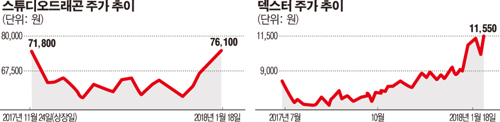 1000만 관객을 돌파한 영화 ‘신과 함께’의 VFX(영상특수효과)를 담당한 덱스터의 주가도 17일 10% 이상 급등하면서 52주 신고가를 경신했다. ‘신과 함께’의 제작비는 200억 원으로 추산된다. 현재 1300만 명의 관객을 동원하면서 1000억 원이 넘는 수익을 거뒀다. 공동 투자사인 덱스터의 수익은 최대 60억 원에 달할 전망이다. 업계 관계자는 “‘신과 함께’가 대만과 홍콩에서도 흥행을 이어가고 있어 해외 판매 수익을 합치면 매출 규모는 더욱 늘어날 것”이라며 “특히 ‘신과 함께’는 특수효과가 부각된 작품인 만큼, 덱스터의 기술력이 인정 받는 결과를 낳았다”라고 말했다.