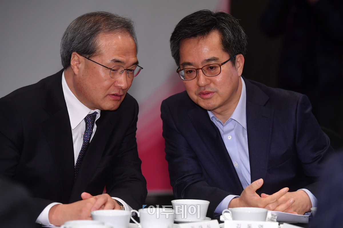 김동연(오른쪽) 경제부총리 겸 기획재정부 장관이 22일 오전 서울 중구 플라자호텔에서 열린 여의도연구원 초청 특강에 참석해 김대식 여의도연구원장과 대화하고 있다. 이동근 기자 foto@