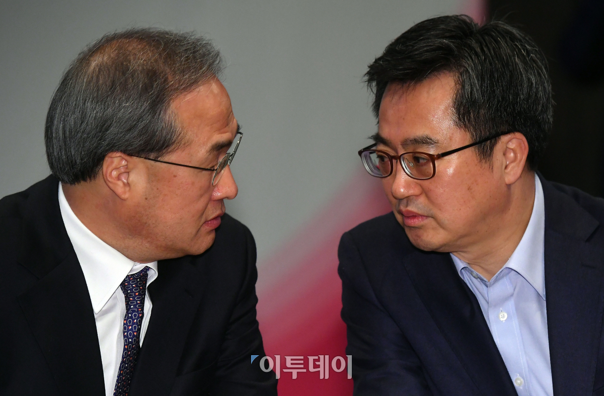 김동연(오른쪽) 경제부총리 겸 기획재정부 장관이 22일 오전 서울 중구 플라자호텔에서 열린 여의도연구원 초청 특강에 참석해 김대식 여의도연구원장과 대화하고 있다. 이동근 기자 foto@
