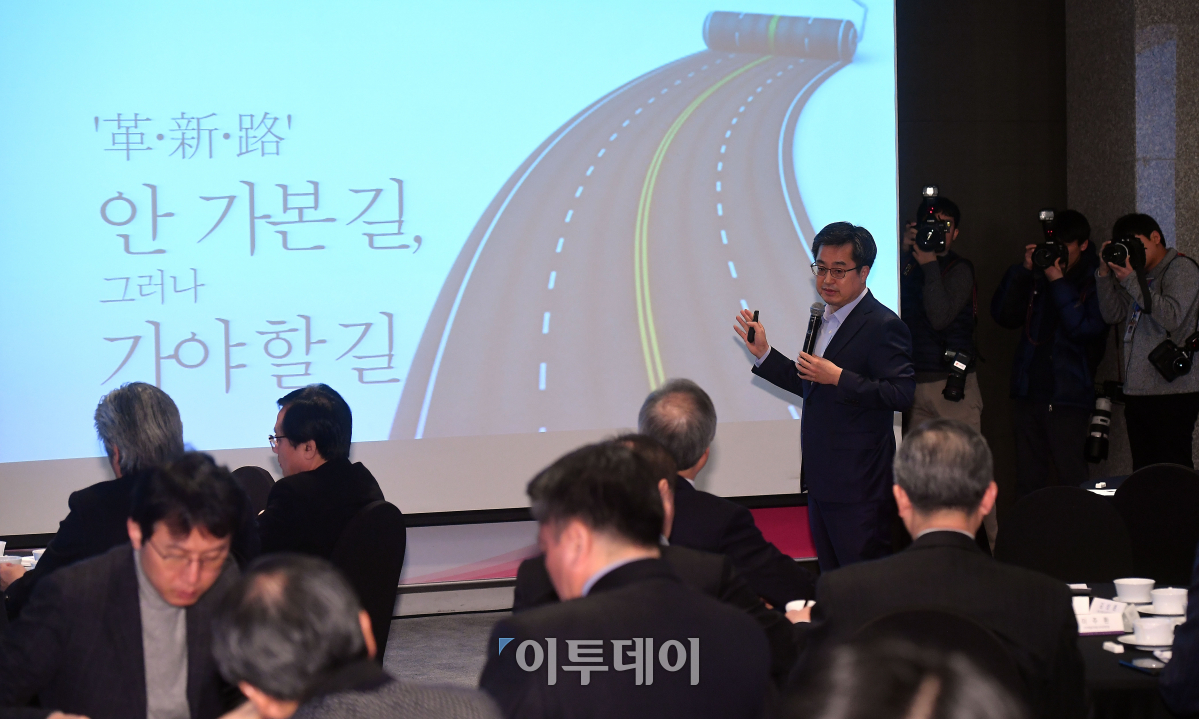 김동연 경제부총리 겸 기획재정부 장관이 22일 오전 서울 중구 플라자호텔에서 열린 여의도연구원 초청 특강에 참석해 '칼레 해전과 칸나이전투, 우리 경제 패러다임의 전환'을 주제로 강연하고 있다. 이동근 기자 foto@
