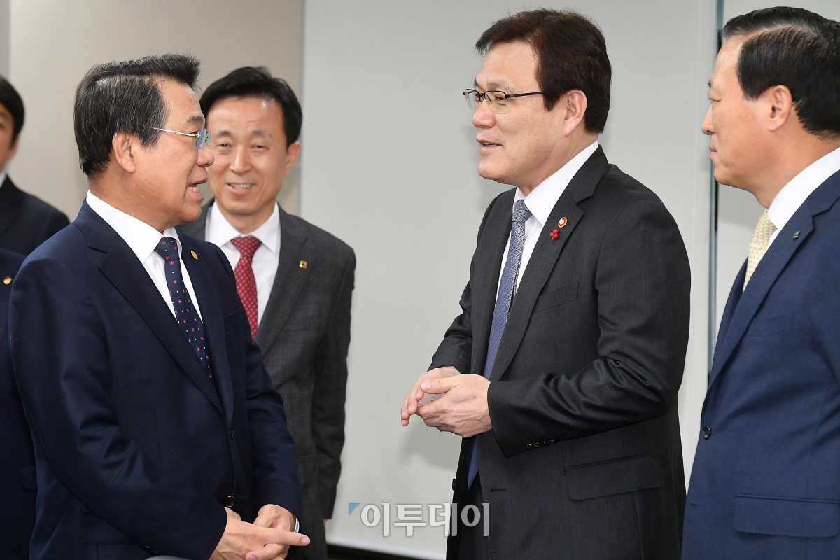 최종구(오른쪽에서 두 번째) 금융위원장과 조찬휘 대한약사회장이 22일 서울 중구 여신금융협회에서 열린 카드수수료 관련 소상공인단체 간담회에서 대화하고 있다. 이동근 기자 foto@