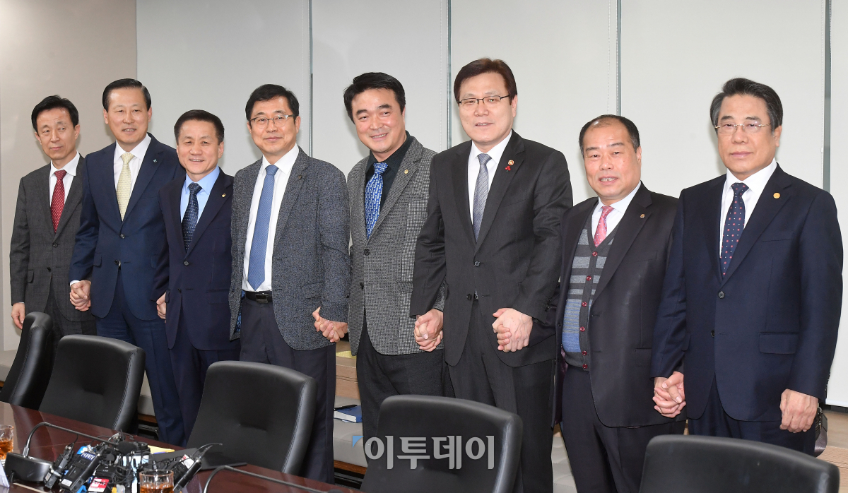 최종구(오른쪽에서 세 번째) 금융위원장이 22일 서울 중구 여신금융협회에서 열린 카드수수료 관련 소상공인단체 간담회에서 참석자들과 손을 맞잡고 기념촬영을 하고 있다. 이동근 기자 foto@