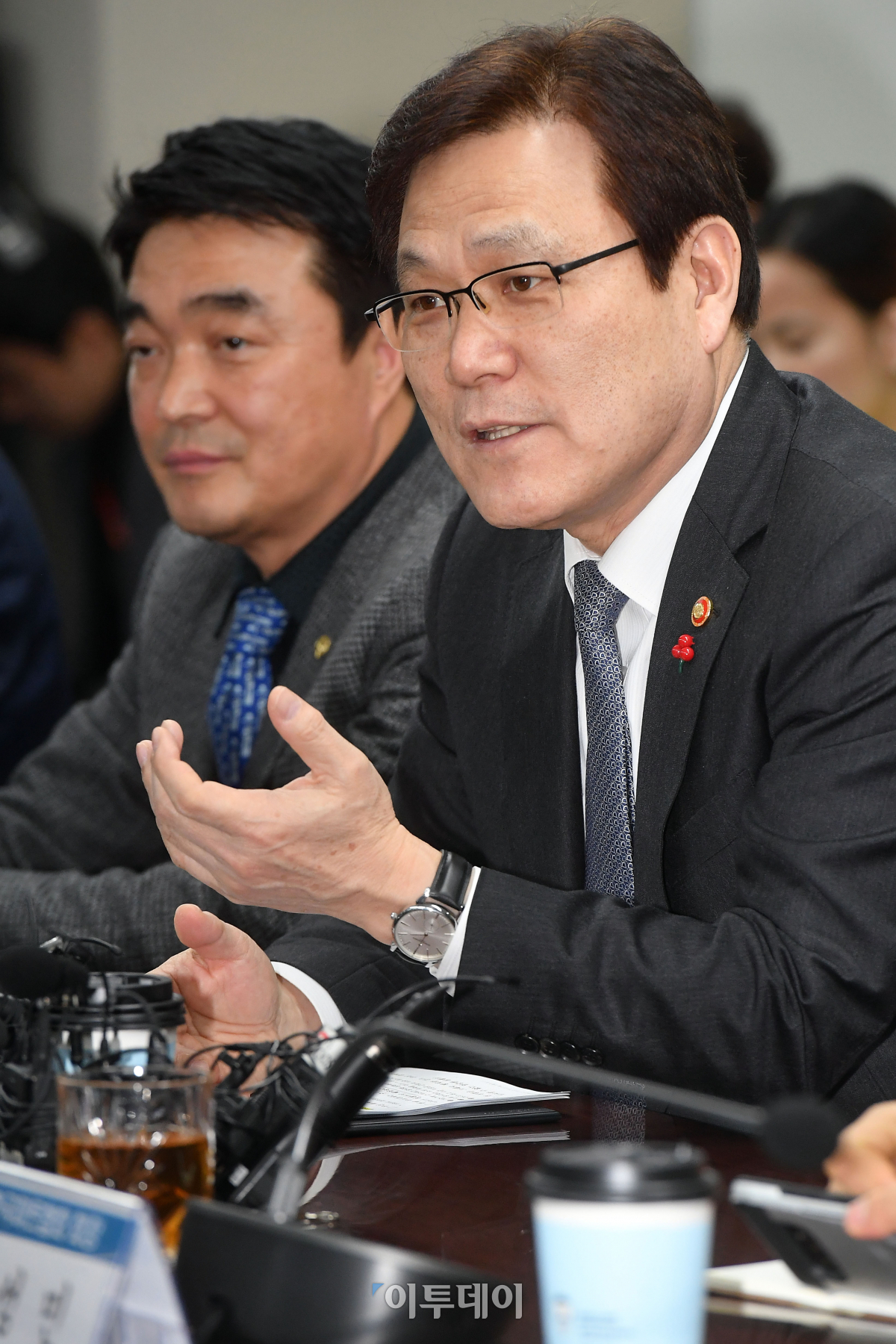 최종구(오른쪽) 금융위원장이 22일 서울 중구 여신금융협회에서 열린 카드수수료 관련 소상공인단체 간담회에서 참석자들과 대화하고 있다. 이동근 기자 foto@