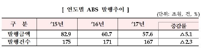 23일 금융감독원에 따르면 지난해 ABS 발행액은 57조6000억 원으로 전년보다 5.1% 감소했다. 같은 기간 발행건수도 167건으로 2.3% 줄었다.