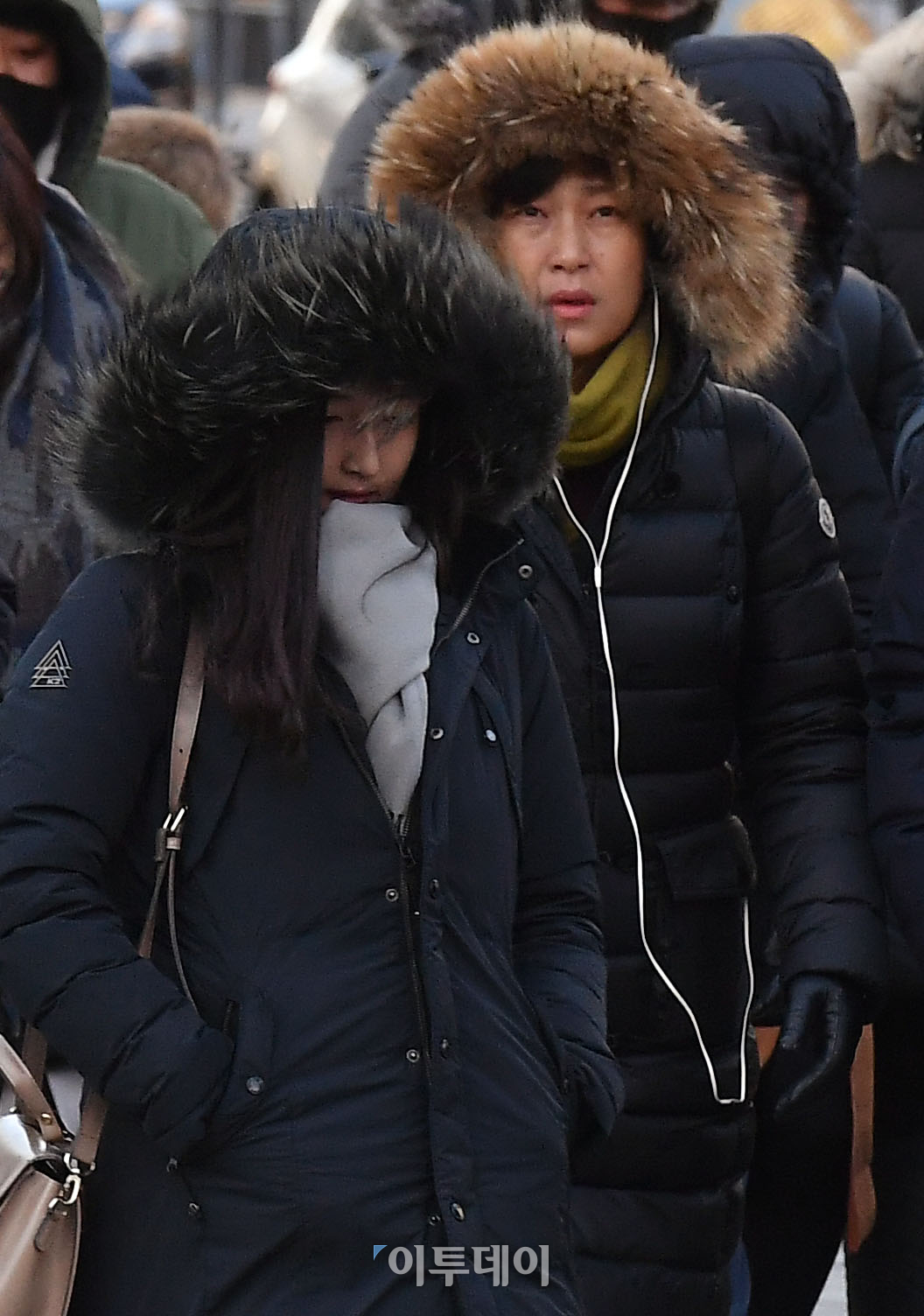 서울의 아침 최저기온이 영하 13도까지 떨어지는 등 중부지방에 한파특보가 발효된 23일 오전 서울 세종대로사거리에서 시민들이 두터운 옷을 껴입고 발걸음을 재촉하고 있다. 기상청은 당분간 내륙을 중심으로 아침 최저 기온이 영하 10~15도 안팎으로 떨어지며 한파가 지속될 것으로 예보했다. 이동근 기자 foto@