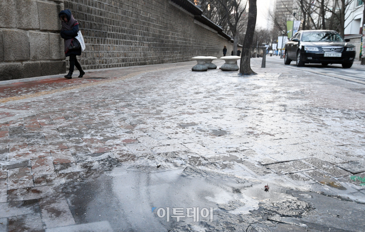 서울의 아침 최저기온이 영하 13도까지 떨어지는 등 중부지방에 한파특보가 발효된 23일 오전 서울 중구 정동길에서 시민들이 빙판길을 피해 잰걸음을 옮기고 있다. 기상청은 당분간 내륙을 중심으로 아침 최저 기온이 영하 10~15도 안팎으로 떨어지며 한파가 지속될 것으로 예보했다. 이동근 기자 foto@