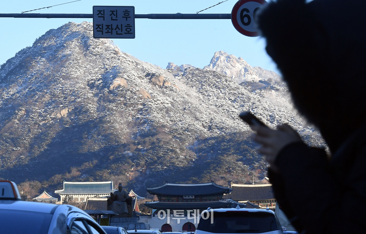 서울의 아침 최저기온이 영하 13도까지 떨어지는 등 중부지방에 한파특보가 발효된 23일 오전 서울 세종대로사거리에서 바라본 북악산에 눈이 덮여 있다. 기상청은 당분간 내륙을 중심으로 아침 최저 기온이 영하 10~15도 안팎으로 떨어지며 한파가 지속될 것으로 예보했다. 이동근 기자 foto@