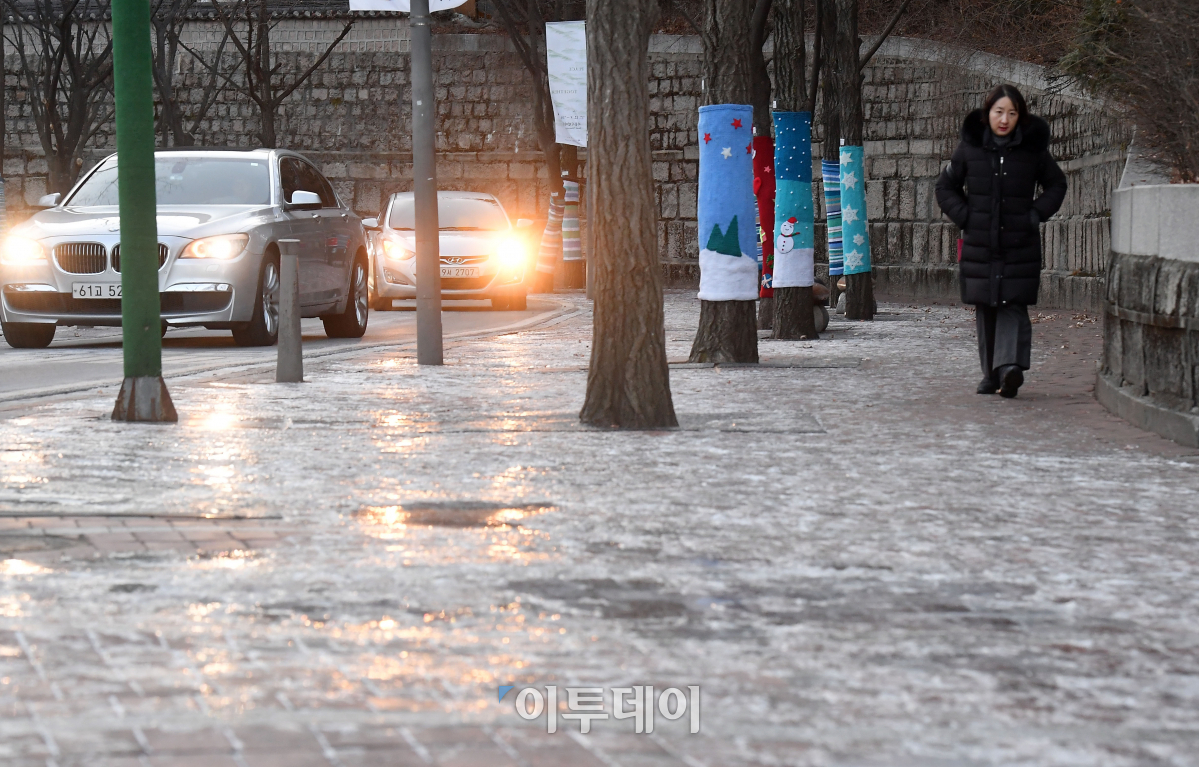 서울의 아침 최저기온이 영하 13도까지 떨어지는 등 중부지방에 한파특보가 발효된 23일 오전 서울 중구 정동길에서 한 시민이 빙판길을 피해 잰걸음을 옮기고 있다. 기상청은 당분간 내륙을 중심으로 아침 최저 기온이 영하 10~15도 안팎으로 떨어지며 한파가 지속될 것으로 예보했다. 이동근 기자 foto@